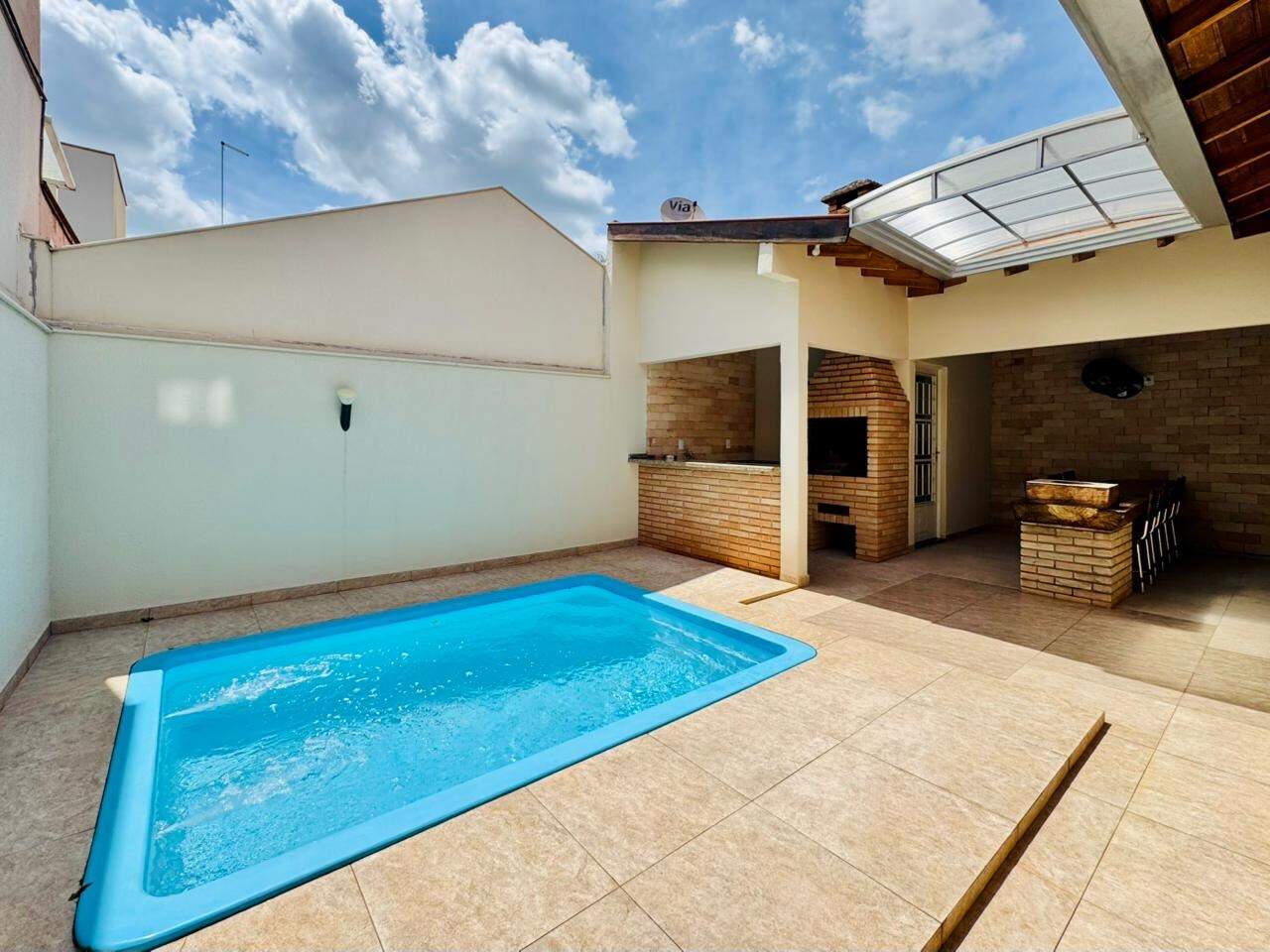 Ao fundo uma área de lazer com piscina, churrasqueira, mesa fixa, cooktop e área de serviço independente.